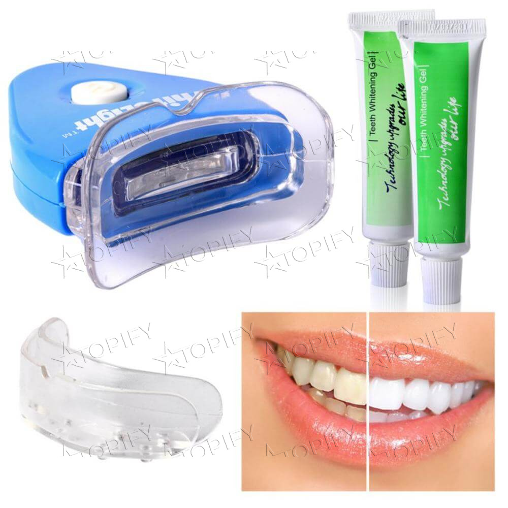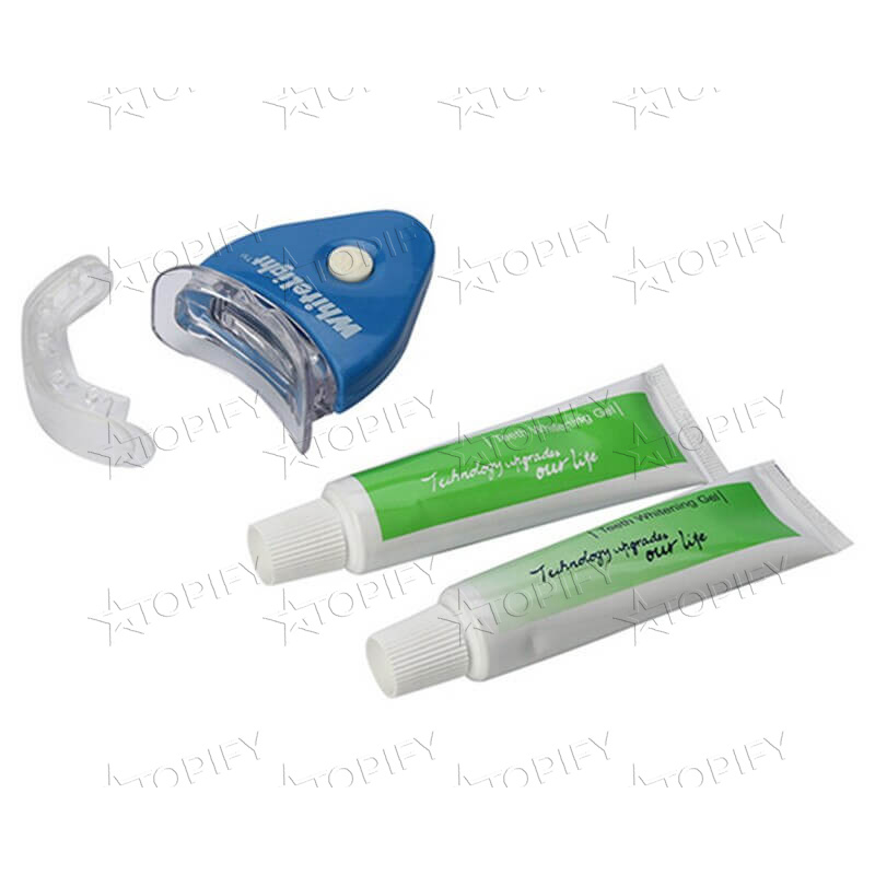 Уникальность этой методики заключается в применении современной технологии двухкомпонентного геля. Происходит смешивание отбеливающего средства и геля, содержащего активный компонент. Сочетание с двухкомпонентным гелем дает световой технологии возможность отлично снимать пятна с зубной поверхности и тщательно отбеливать ее, проникая в пористую структуру зуба. Важным плюсом отбеливания White Light является абсолютная безвредность света в приборе для организма человека. Инструкция: 1. Почистите зубы. 2. Откройте упаковку с гелем. 3. Используйте узкую полоску (приблизительно шириной в пол сантиметра) геля при намазывании верхних и нижних частей капы. 4. Приложите капу к вашим зубам. 5. Используйте источник света перед капой. 6. Обхватите губами верхнюю оправу так чтобы удержать ее во рту. 7. Нажмите на кнопку чтобы включить источник света. Для интенсивного отбеливания используйте это устройство в течении 30 минут 1 раз в день в течении 5-7 дней.